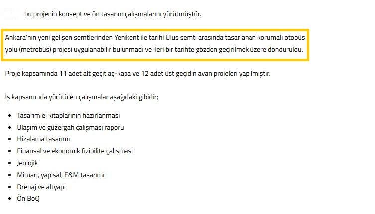 Projeye dair firma, “Ankara’nın yeni gelişen semtlerinden Yenikent ile tarihi Ulus semti arasında tasarlanan korumalı otobüs yolu (metrobüs) projesi uygulanabilir bulunmadı ve ileri bir tarihte gözden geçirilmek üzere donduruldu” ifadelerine yer verildi.