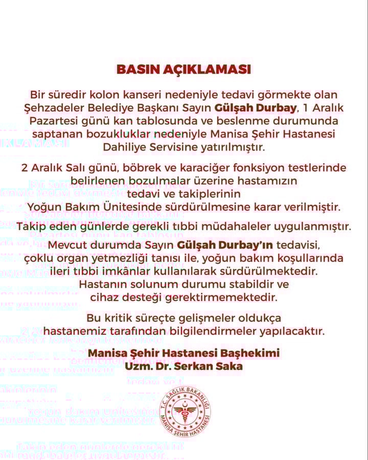 “Bir süredir kolon kanseri nedeniyle tedavi görmekte olan Şehzadeler Belediye Başkanı Sayın Gülşah Durbay, 1 Aralık Pazartesi günü kan tablosunda ve beslenme durumunda saptanan bozukluklar nedeniyle Manisa Şehir Hastanesi Dahiliye Servisine yatırılmıştır.